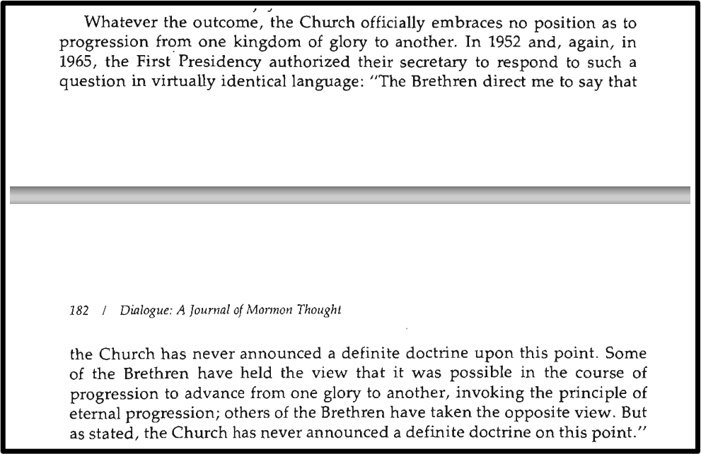 “The brethren direct me to say that the Church has never announced a definite doctrine upon this point. Some of the brethren have held the view that it was possible in the course of progression to advance from one glory to another, invoking the principle of eternal progression; others of the brethren have taken the opposite view. But as stated, the Church has never announced a definite doctrine on this point.”